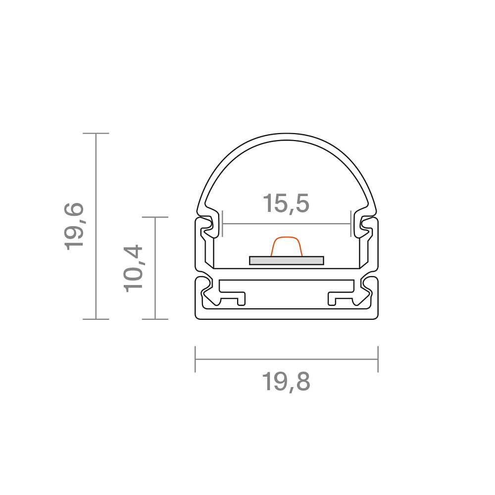 The Aluminum Mounting Rail measures 200 x 1.98 x 1.04 cm (length x width x height). With a height of 1.98 cm, it offers ample space for installing LED strips and ensures a discreet and professional look in your space.