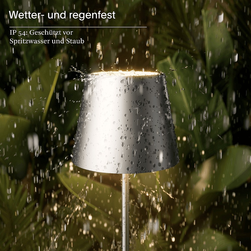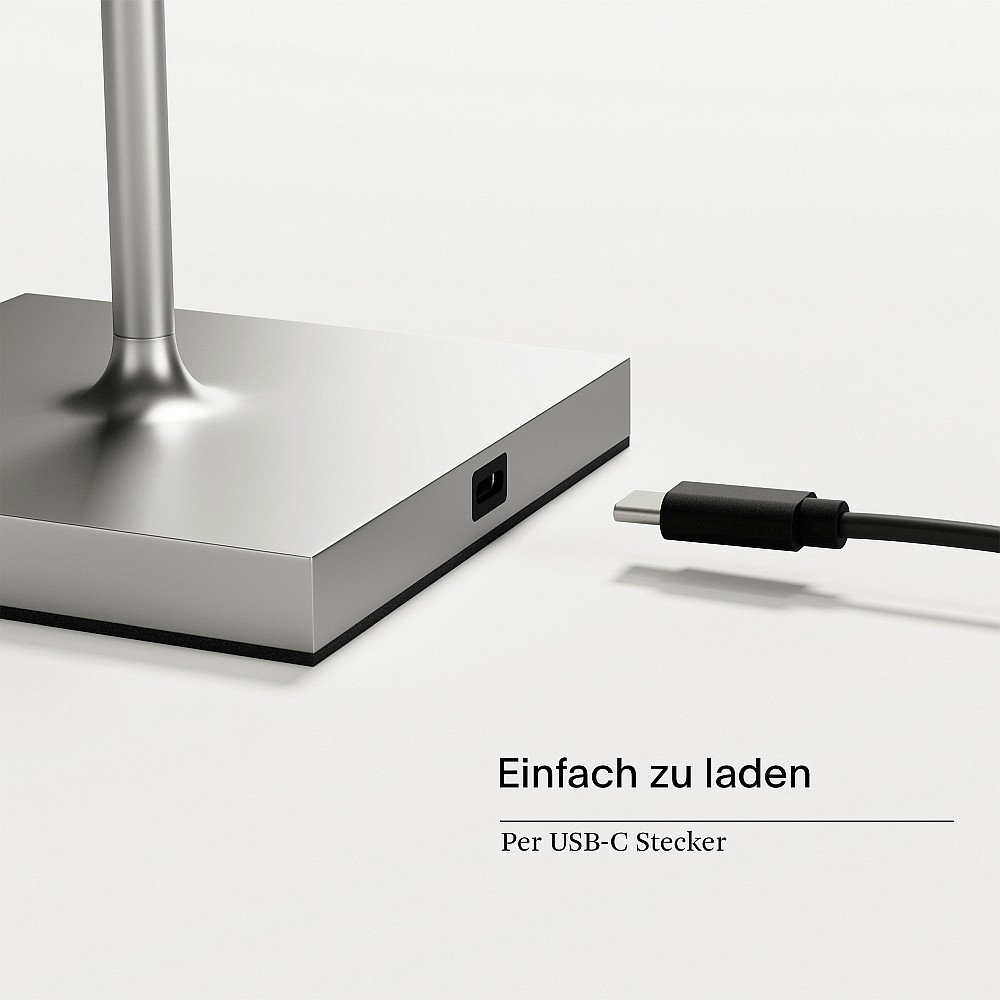 Thanks to the integrated touch dimmer, the brightness of the lamp can be individually adjusted. The lamp has a runtime of up to 12 hours, and the 4,400 mAh battery can be recharged in just 5 to 7 hours. The lamp has a USB-C connection option and a 120 cm long connection cable.